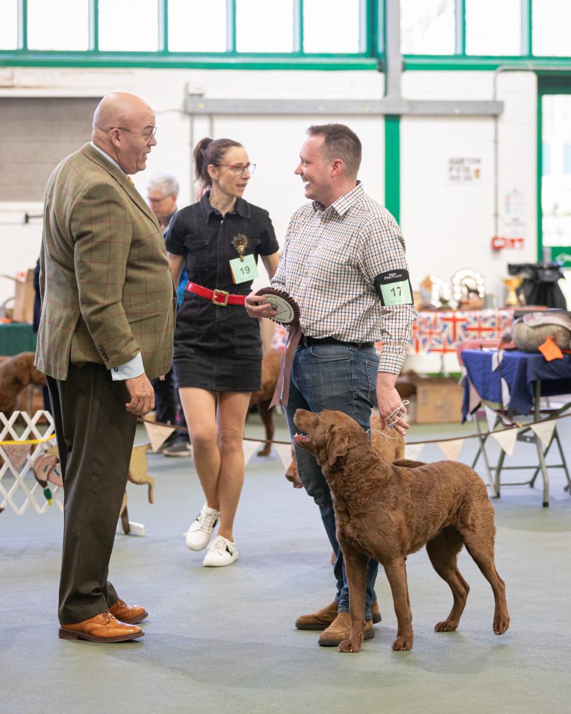 Judging was delayed for half an hour due to the traffic and then Colin Woodward started going over and examining each of the 26 dogs present. His final decision for the best of breed went to the Our Dogs top dog in the breed for 2025, namely Mayhew and Middleton’s Sh Ch Arnac Bay Hebe who won yet another CC to add to her already considerable number. The Dog CC this time went to Cathy and Simon Broomfield’s home-bred Glaneils Count on Me. This is his second CC so hopefully it shouldn’t be too long before he gains his ‘crown’ and adds another Chesapeake Show Champion to the list.